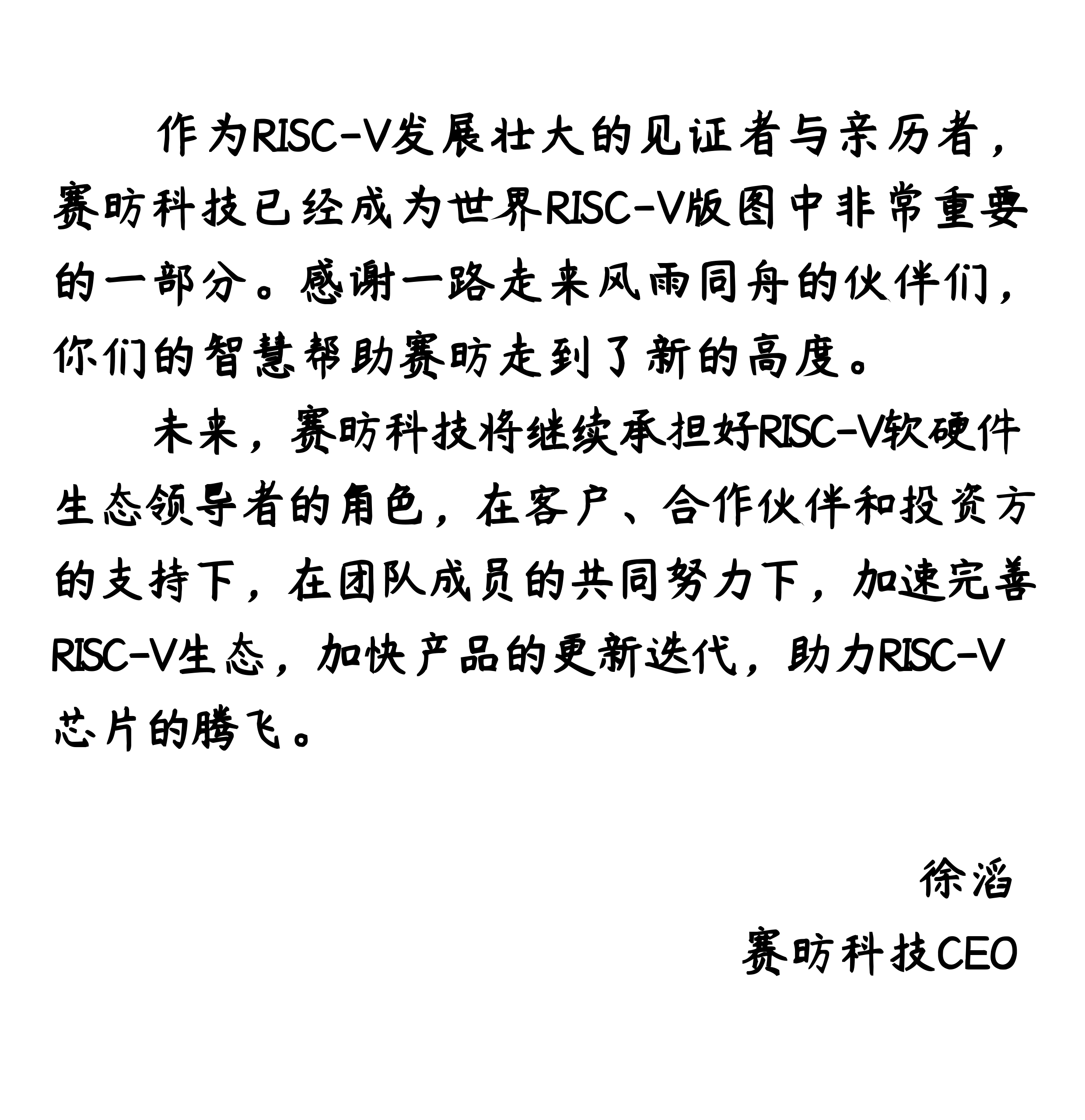 赛昉科技扎根中国,放眼世界,矢志于成为全球 RISC-V 技术和生态的推动者和领导者。未来赛昉科技将会从内核层、系统服务层、框架层和应用层等各方面与国内外生态合作伙伴开展全面的合作,通过引领RISC-V技术的发展,驱动产业创新,进而使得RISC-V进入更多高端应用领域,为全球开发者及客户创造更多的价值。