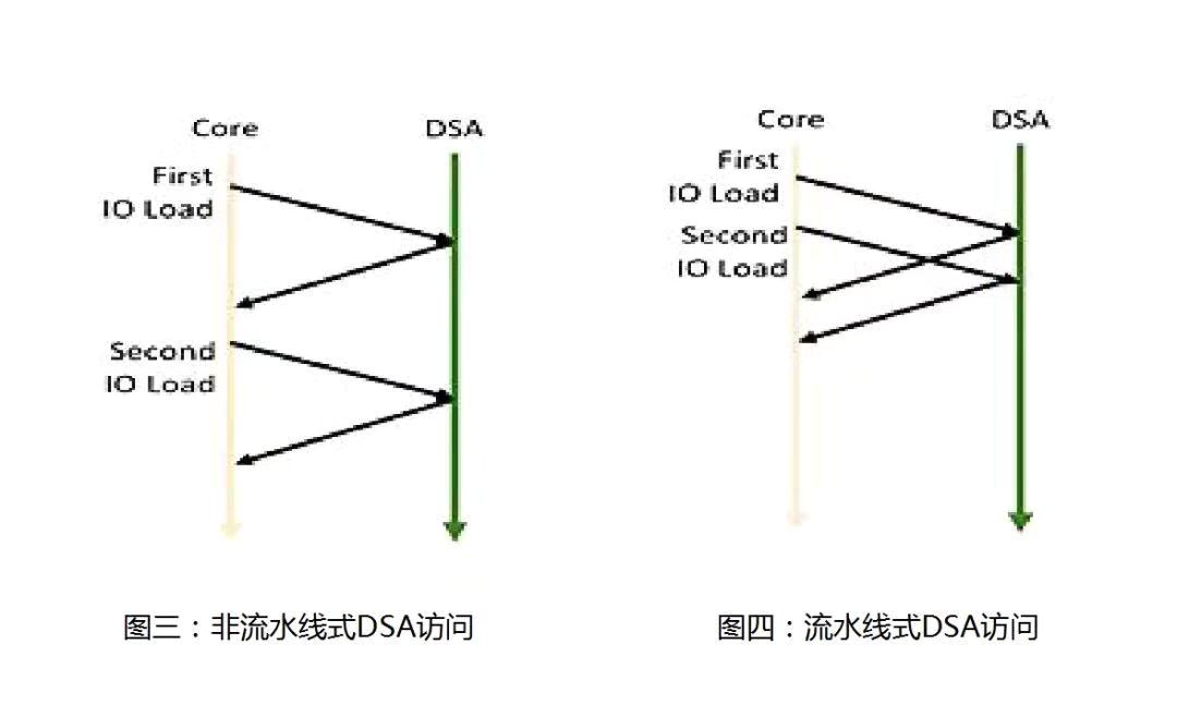 实现这种点对点排序的简单方法就是向DSA发出一个负载,然后等待返回内核的结果(图3)。因为不能以流水线方式连续地向DSA内存加载或存储数据,所以这种方法是非常低效的。RISC-V的实现机制通常是在内核与DSA之间互连的作用下以流水线方式实现此类IO负载(图4)。例如,如果网状拓扑使用从内核到DSA(可能通过IO桥接器)的固定路径(例如X-Y路径),则互连可以保证其排序并且允许对DSA内存进行非常高的带宽访问。