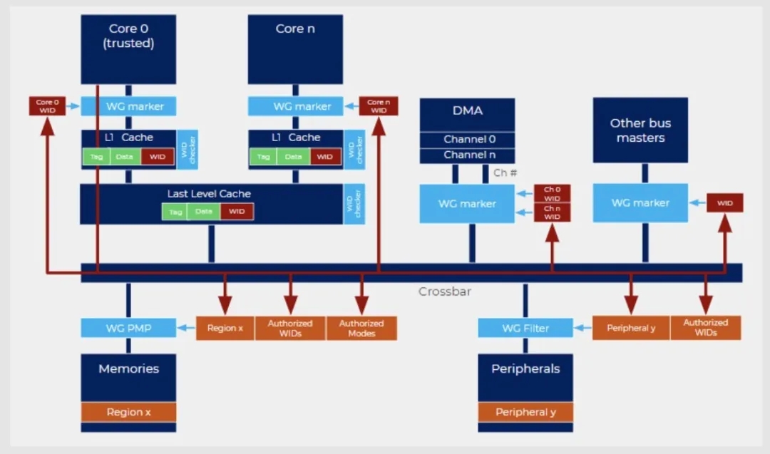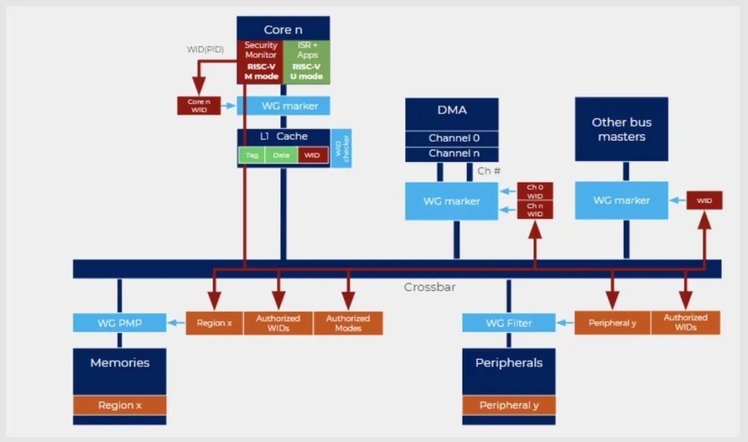 在上面所显示的多核处理器中,World ID标记用来将进程彼此隔离,以确保保护和隔离的运算执行。在SoC内部,WID标记从内核扩展到了高速缓存、互连、外围设备、总线主控器、DMA区域和存储器。在高性能多核系统中,应用程序或OS环境都可以被隔离和保护。对于更为普遍的单核嵌入式系统,例如,使用PID驱动的运算WID来保护和隔离用户模式和机器模式之间的执行。