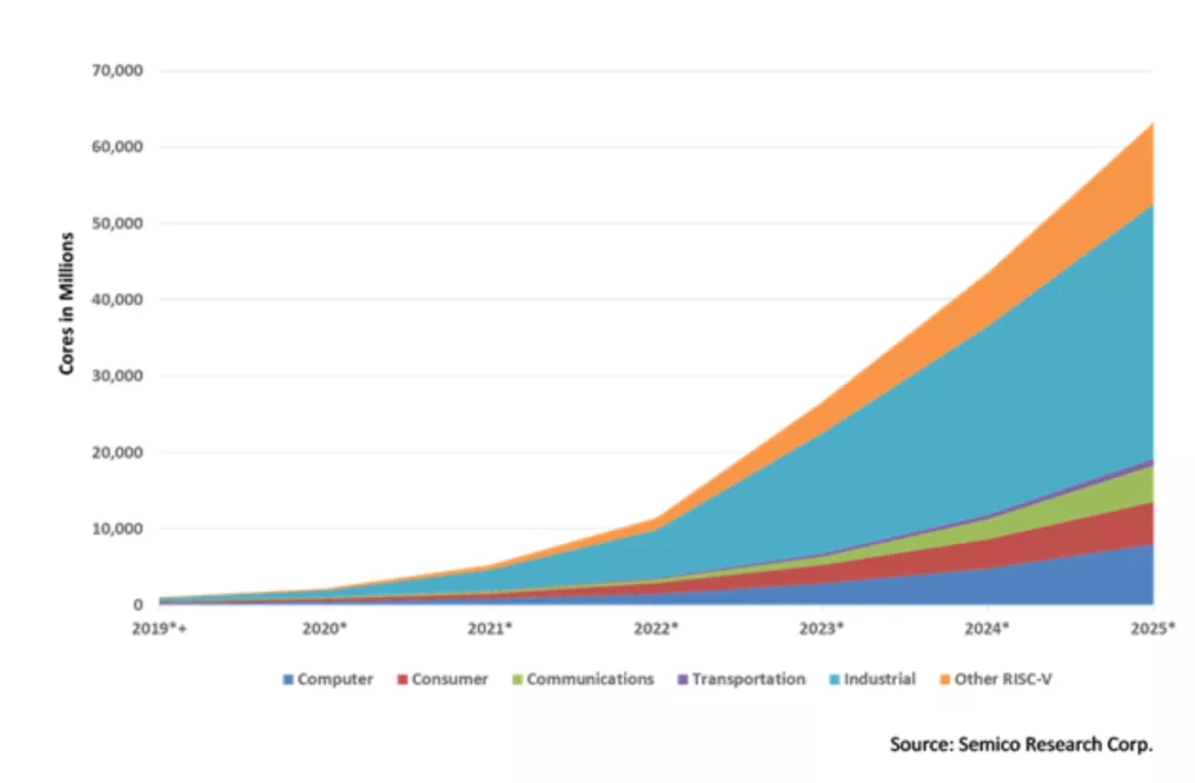 Semico Research的最新市场调研报告预测,预计到2025年,采用RISC-V架构的芯片数量将达到624亿颗,2018年-2025年的年复合增长率(CAGR)高达146.2%,主要应用市场包括计算机、消费电子、通信、交通和工业,其中物联网应用市场占比最高,约为167亿个内核。