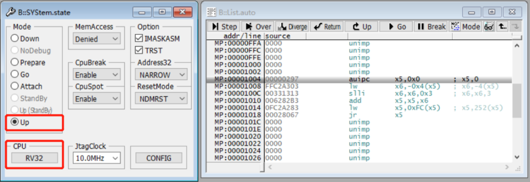 针对SiFive E76,TRACE32®只需从CPU列表中选择通用核RV32,便可以通过点击Up快速连上芯片。