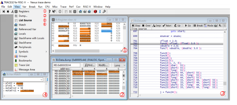 TRACE32®连上SiFive E76 Core后,通过界面的快捷工具栏,可以对E76进行单步、全速运行、暂停等控制。同时,在这个过程中也可以通过View菜单,观察一些调试资源,例如:寄存器、内存、C/C++源码、变量等等。