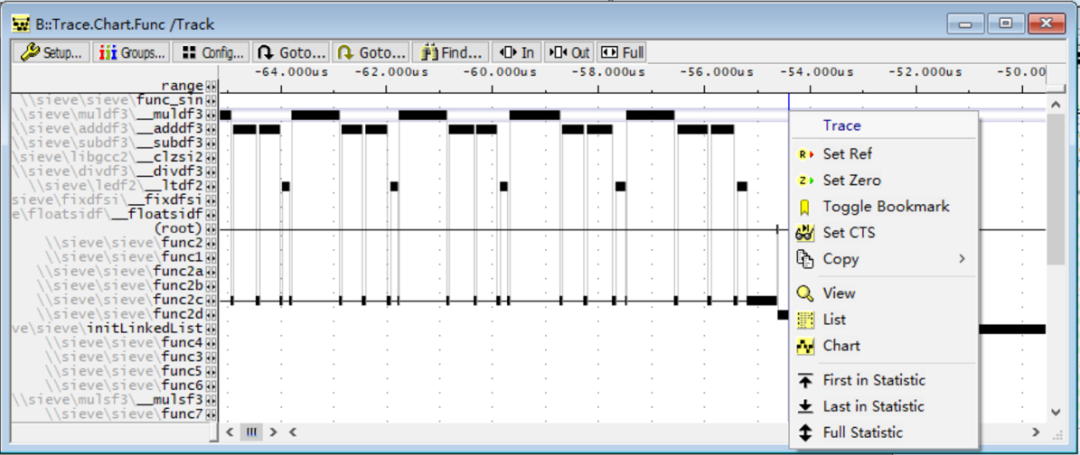 基于采集下来的Trace数据,TRACE32®可以将函数的相互调用关系绘制成时序图。同时,在观察分析时,可以对某个关键点,设置CTS(Context Tracking System, TRACE32®基于Trace的上下文重建功能)。