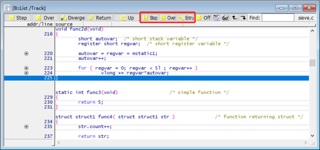 进入CTS模式后,List源码窗口也会发生相应的改变:源码程序会定位到关键点,同时程序控制按钮,除了原来的Step、Step Over等功能外,还多了一些反向的Step、Step Over按钮。基于这些功能,便能够在程序有可能出问题的关键点,反复分析,观察当时程序的上下文以及寄存器等情况,快速地定位程序BUG位置。