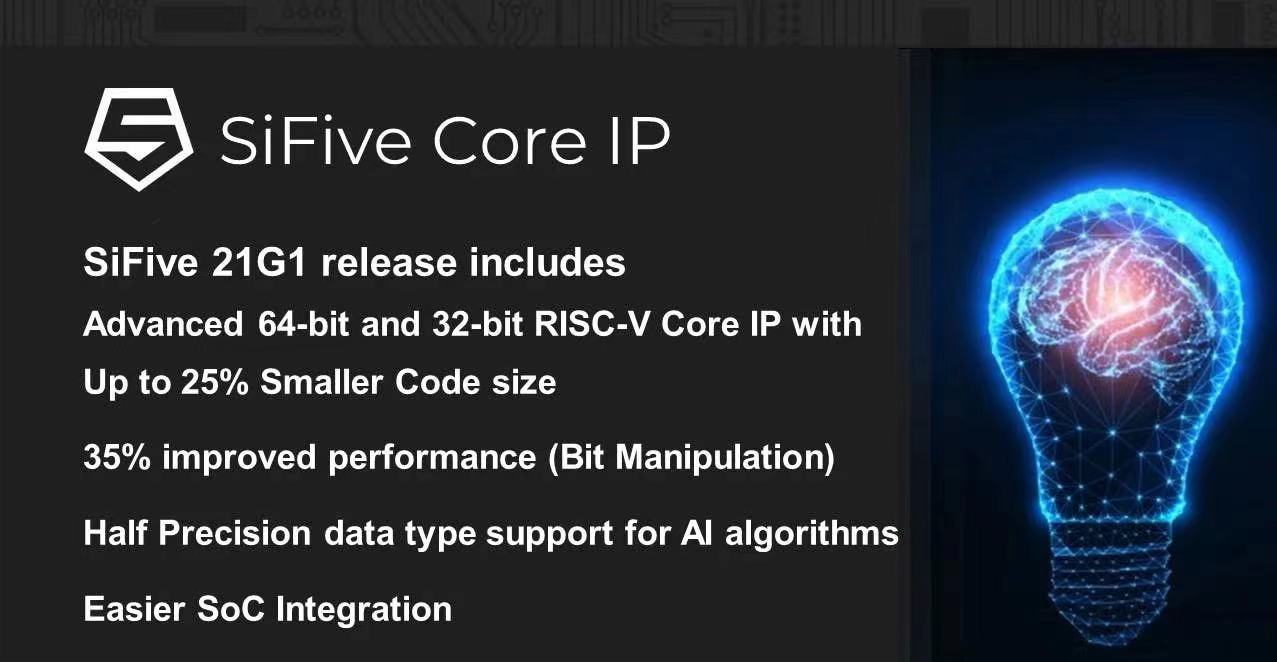 SiFive 21G1版本提供新的先进的计算能力,包括位操作组合、半精度浮点以及高达25%的代码减少量。软硬件的SoC集成也已针对更高效计算、更小的尺寸和更快的上市时间做了优化。