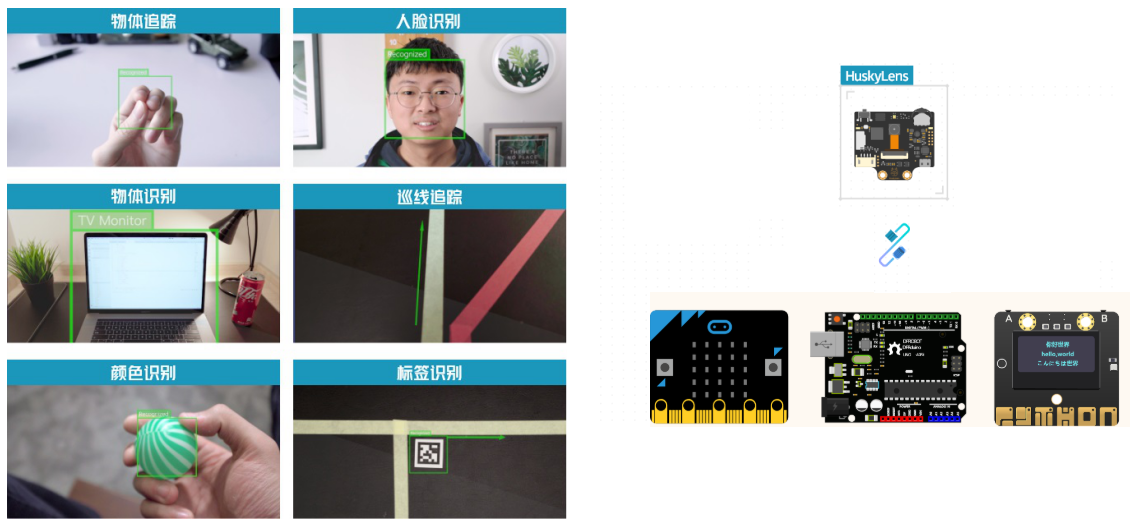 本巡线小车采用HUSKYLENS(二哈识图)作为视觉传感器。HUSKYLENS作为一款简单易用的人工智能摄像头(视觉传感器),内置了6种功能:人脸识别、物体追踪、物体识别、巡线追踪、颜色识别、标签识别、物体分类、二维码识别、条形码识别。仅需一个按键即可完成AI训练,摆脱繁琐的训练和复杂的视觉算法,使开发者能够更加专注于项目的构思和实现。HUSKYLENS板载UART / I2C接口,可以连接到Arduino、Raspberry Pi、LattePanda、Microbit等主流开发板,实现硬件无缝对接,直接输出识别结果给控制器,无需折腾复杂的算法,就能制作非常有创意的项目。本次小车展品实现了HUSKYLENS与赛昉科技RISC-V主控开发板的适配。